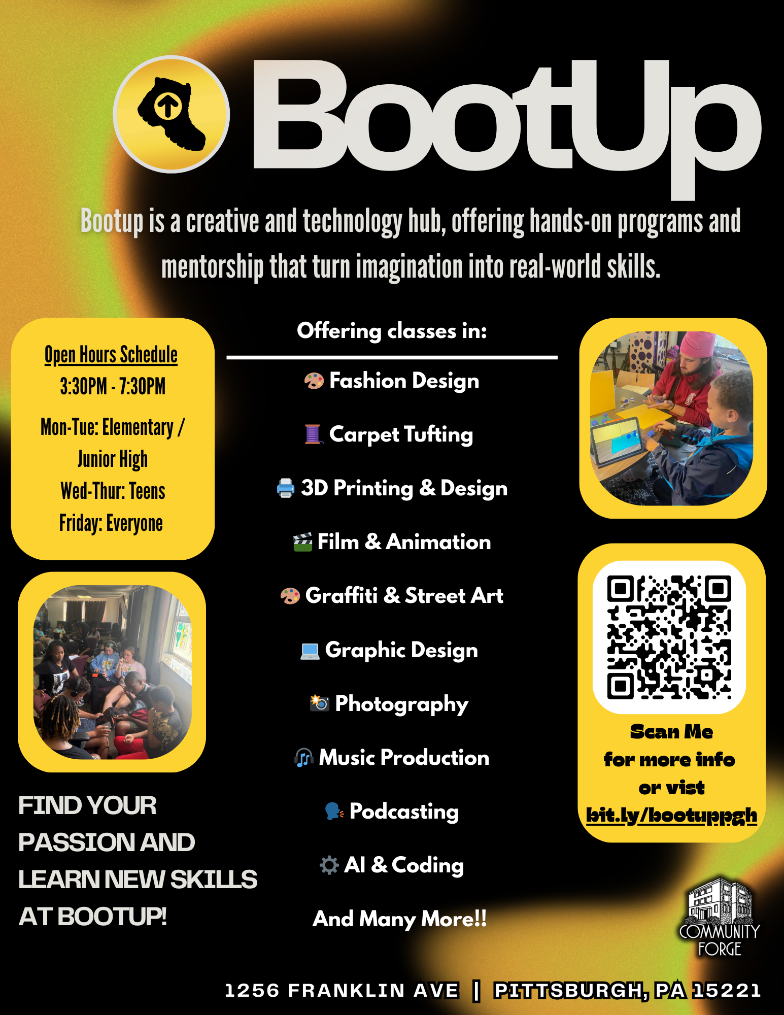 The program takes place in the BootUp Headquarters @ Community Forge and serves youth from grades 3 - 12.